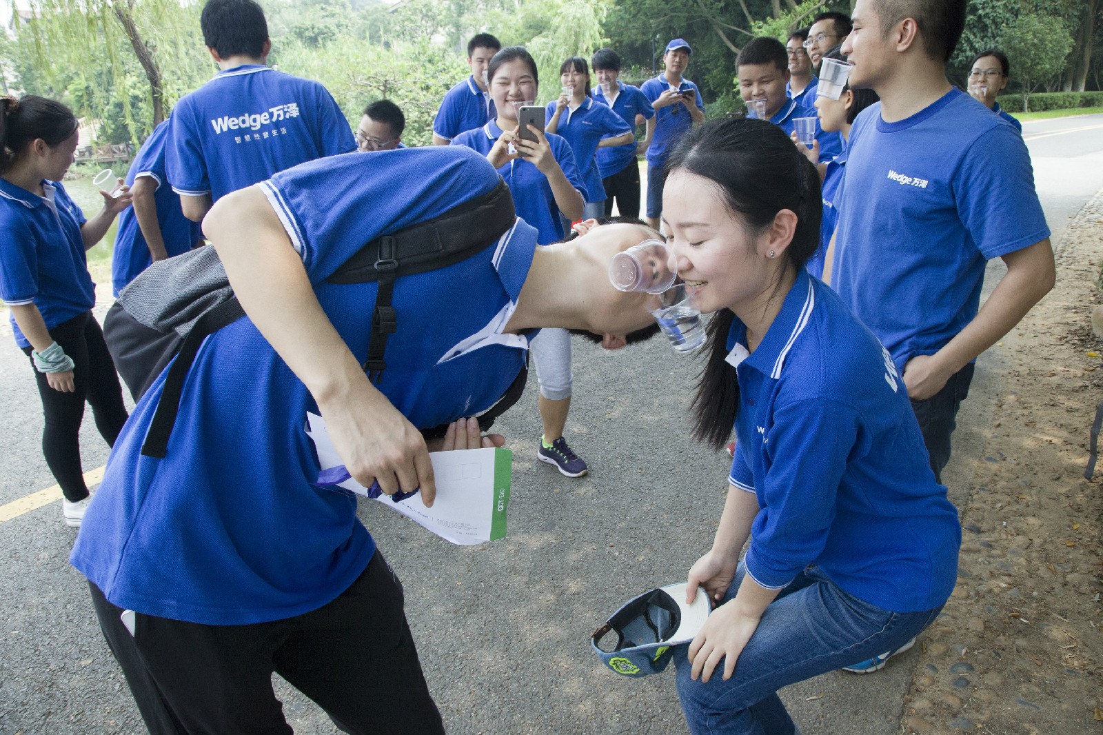 早晨8点30分,PP电子(中国区)官方网站工会的青年会员们统一身穿公司蓝色文化衫,统一乘车前往拓展基地——东莞松山湖风景区。到达目的地后,在拓展公司专业教练的带领下,首先开展了团队破冰——男女青年会员“天使和仆人”游戏,让参加活动的男女队员建立相互信任关系,全身心参与到联谊活动中来。在教练的指导下,全体队员男女搭配,分为两个小队,分别进行了口号、队歌和队形设计和形象展示。随后,由各队长向教练领取《定向穿越任务书》,分别组织队员开展了桃花岛“衔杯传水”、珍稀特果园寻找果树、前往虹桥“穿越封锁”、荷香水榭“七巧板”、烟雨亭与“43码大脚”的游客合影、阳光沙滩蜈蚣行走、黄金竹海“最后缘分”等趣味活动。
